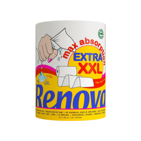 O Rolo de Cozinha Renova Extra XXL MaxiAbsorption foi desenvolvido para oferecer máxima absorção, resistência e durabilidade, ideal para limpezas exigentes no dia a dia. As suas folhas extra largas e espessas garantem maior eficiência e economia, permitindo limpar e secar superfícies com rapidez e comodidade.